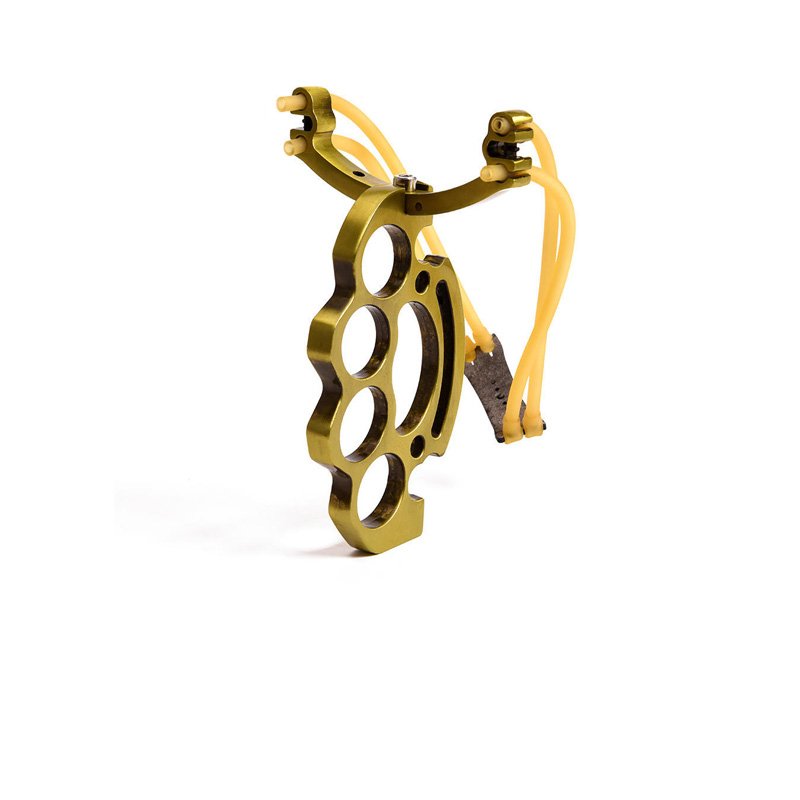 This powerful copper-colored slingshot is crafted from durable metal alloy for strength and precision. Its ergonomic knuckle-style grip ensures a secure and comfortable hold during use. Equipped with high-tension elastic bands, it delivers excellent power and accuracy for target shooting, outdoor training, and hunting. Compact, stylish, and built for performance, this slingshot combines durability with precision control for outdoor enthusiasts.
