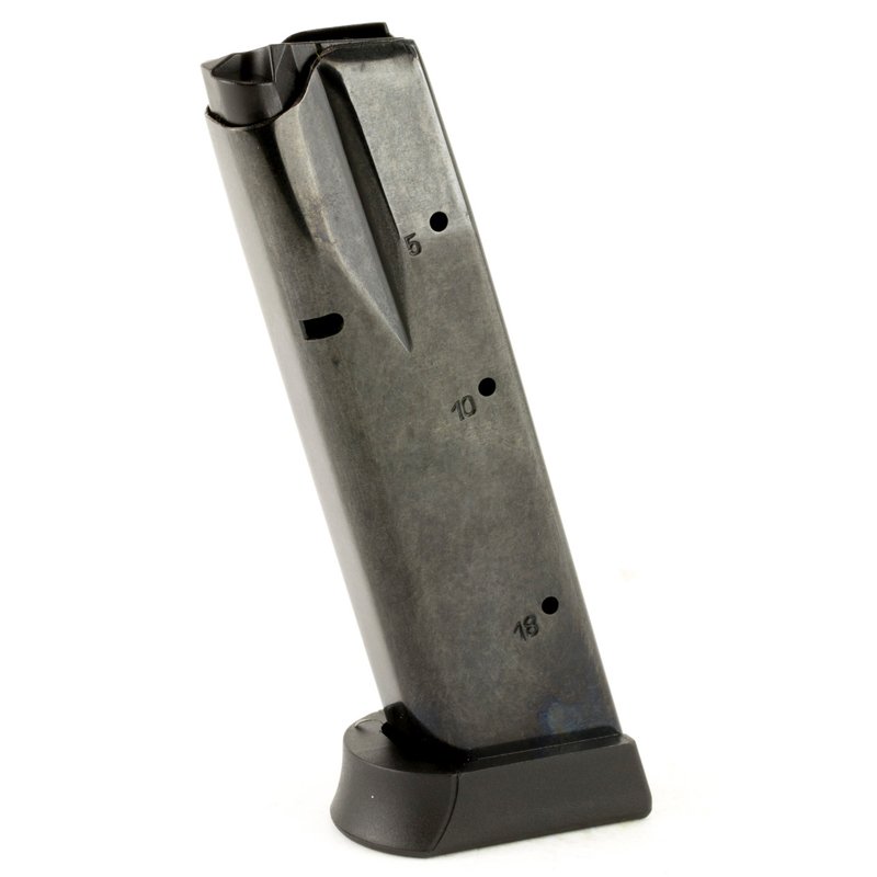 Verify this magazine’s exact pistol model/generation and caliber before buying—fitment, mag-catch cuts and capacity are model-specific. It appears to be a steel-body extended pistol magazine with numbered witness holes and an extended baseplate; check the listed round count and that it’s for your 9×19 (or listed caliber) pistol. Inspect feed lips, follower and spring for damage, avoid over-loading on first use, and function-test several times at the range to confirm reliable seating, feeding and lock-back. Always obey local capacity laws and store magazines unloaded for long-term spring life.