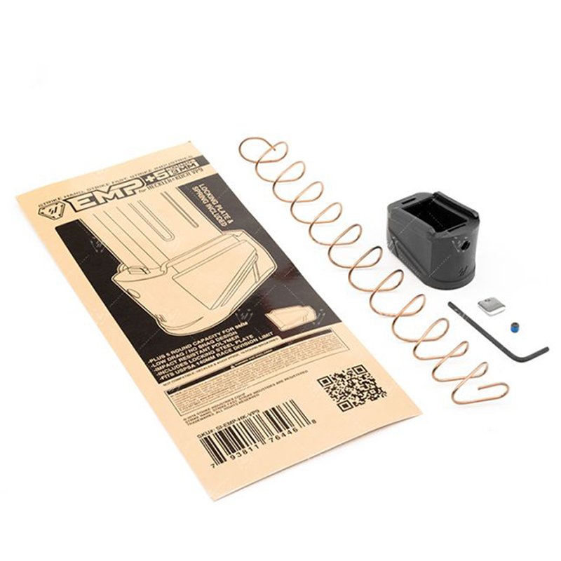 This is a magazine extension kit with spring, base pad, retention plate, and screw for increasing grip/potential capacity—confirm it’s the correct kit for your specific magazine model before purchase. Proper assembly and using the supplied screw (with a tiny drop of thread-locker if desired) are key; always function-test the modified magazine in your firearm to ensure reliable seating, feeding and magazine release. Be mindful of local capacity restrictions and avoid storing mags fully loaded long-term to preserve spring life.