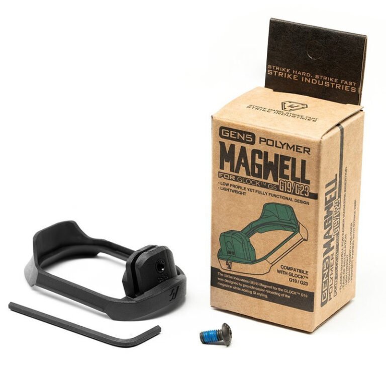 Strike Industries Gen5 polymer magwell made for Glock G19/G23 Gen5 frames — it improves reload speed and index but is not compatible with Gen1–4, full-size frames (G17), or some “compliant” 10-round frames. Install with the supplied screw (a tiny drop of medium thread-locker is recommended), confirm magazines seat and eject cleanly, and function-test at the range before carry or competition. Some extended baseplates or grip inserts may require minor fitment adjustments.